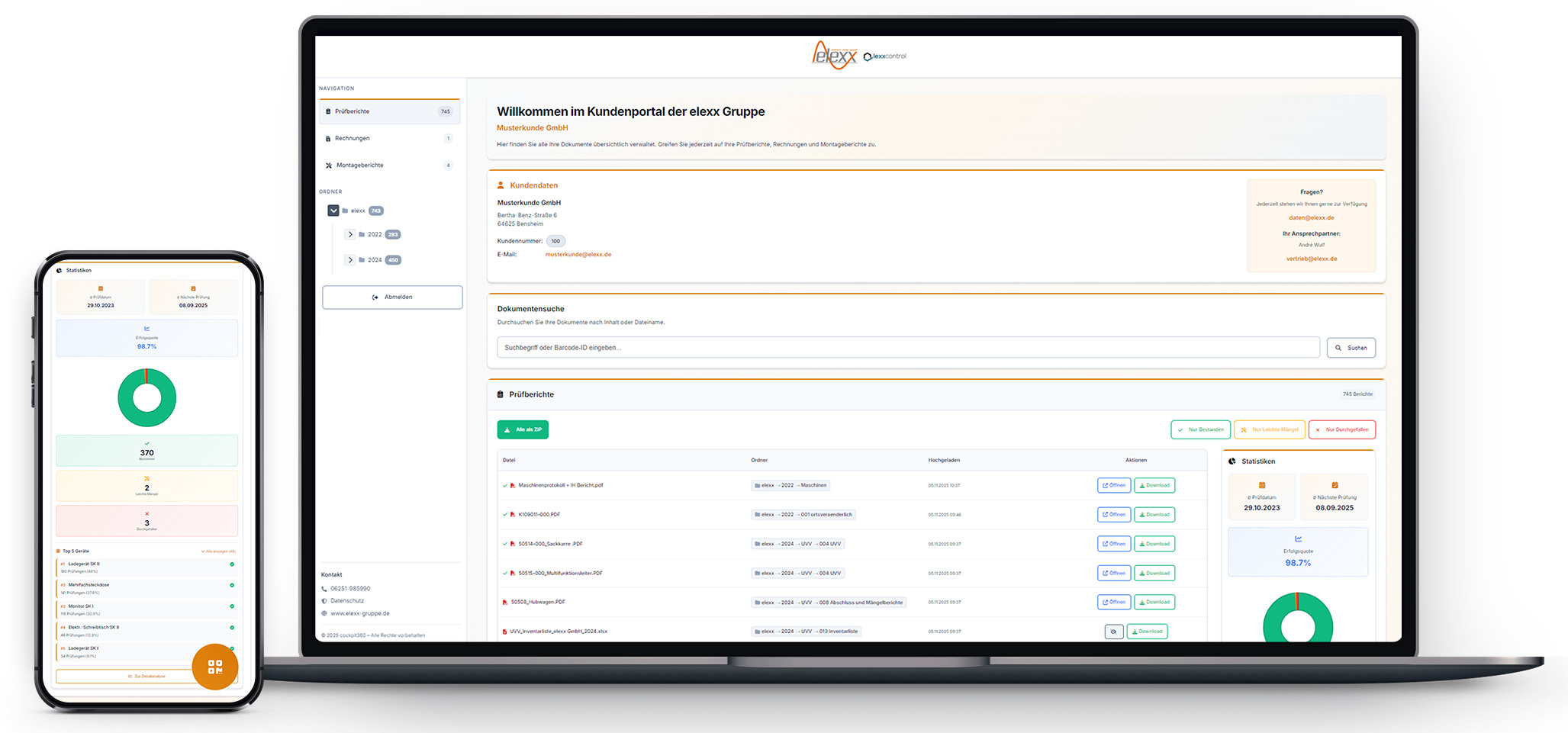 Ihr Vorteil: ein Portal für alles. Das elexx Kundenportal bietet unbegrenzte Möglichkeiten für eine moderne, rechtssichere und effiziente Prüfdokumentation.