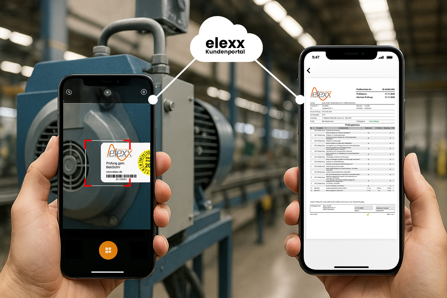Öffnen Sie das elexx Kundenportal auf Ihrem Smartphone und nutzen Sie die integrierte Kamera – eine zusätzliche App ist nicht nötig. Vor Ort scannen sie am Prüfling oder der Maschine den vorhandenen Barcode. Nach dem Scannen öffnet sich der passende Prüfbericht automatisch direkt auf Ihrem Display – schnell, intuitiv und vollständig digital.